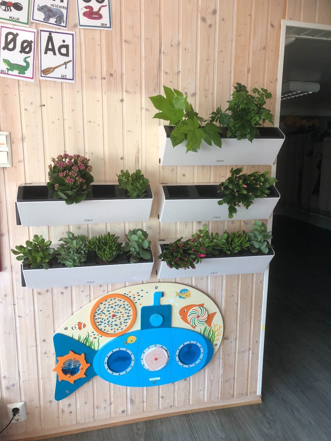 Nå har vi fått blomstervegg i barnehagen. Vi skal lage den litt større og tar imot planter med glede. Blomster gjør innemiljøet bedre, både luft og glede av planter.